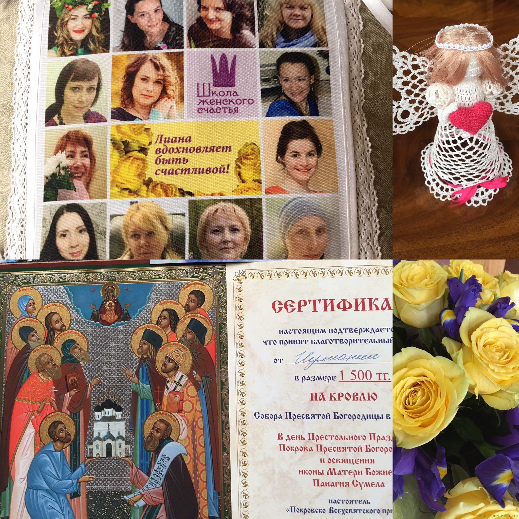 А вот совершенно необыкновенный подарок из Казахстана – сертификат о внесении от имени Иулиании 1500 теньге на строительство Храма Покрова Пресвятой Богородицы в городе Алматы, и на обороте слова св. Иоанна Кронштадского: «Если на Вашу долю выпала честь строить Дом Божий, примите это как великий дар Творца, ибо десница Господня касается того, кто строит храмы, и многие грехи простит тому Господь».