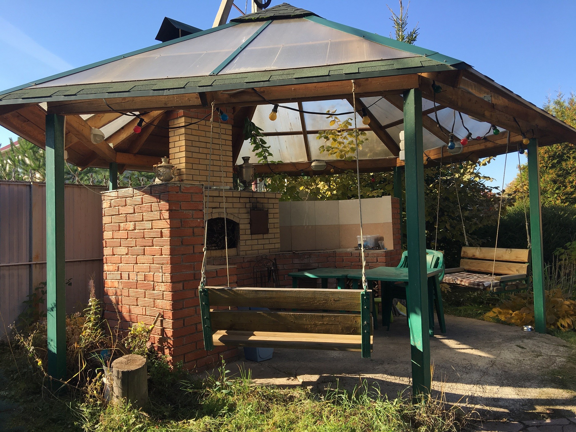 2) Беседка с двумя диванчиками-качелями. Когда-то мы в Китае высмотрели такую красоту и немедленно организовали у себя — чтоб беседка, стол, и у стола качели на тросиках.
