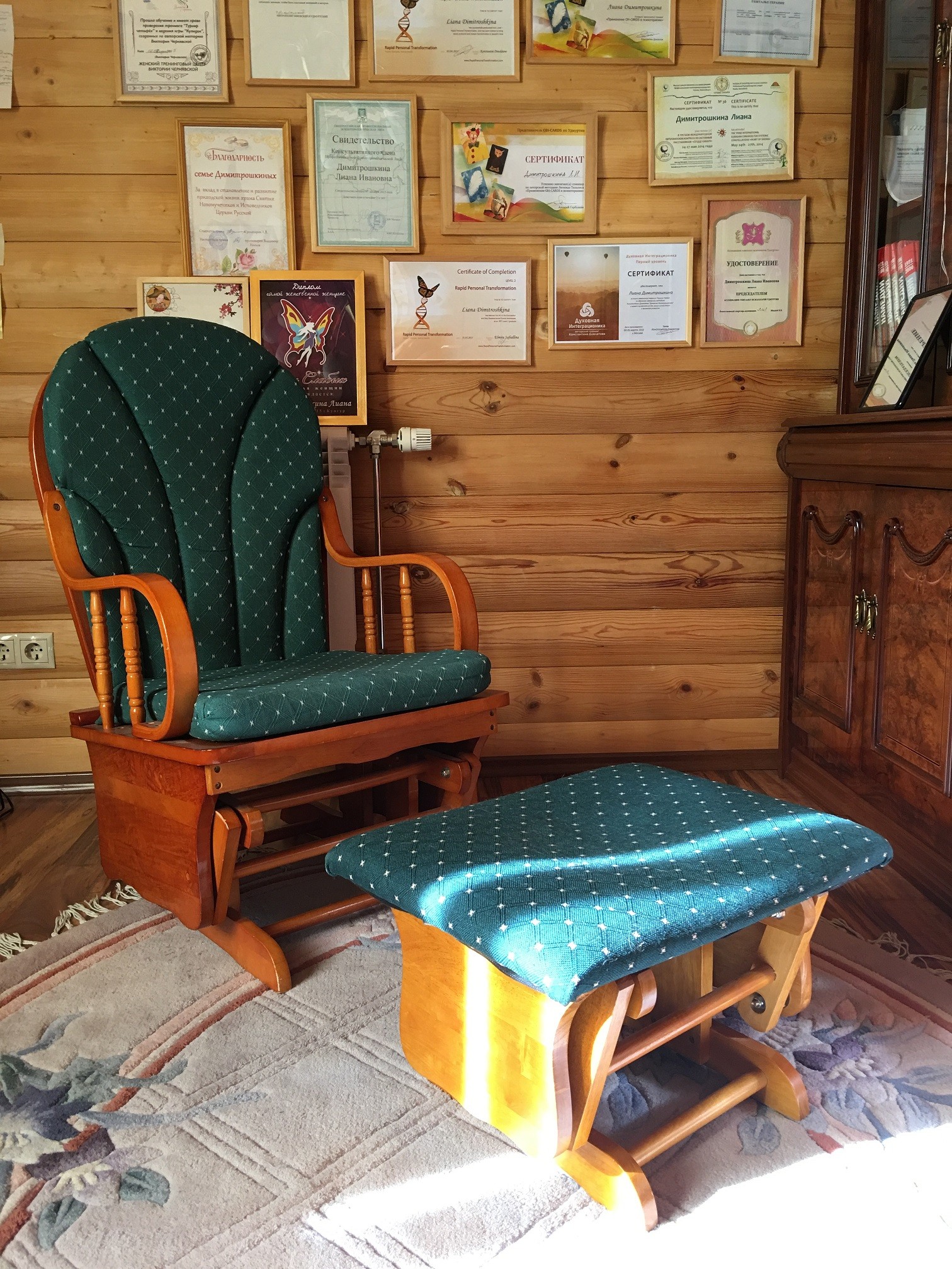 3) кресло-качалка с табуреткой-качалкой, они в моём кабинете. Когда-то президент нашей маленькой Удмуртии подарил на мой юбилей. Очень люблю это кресло.