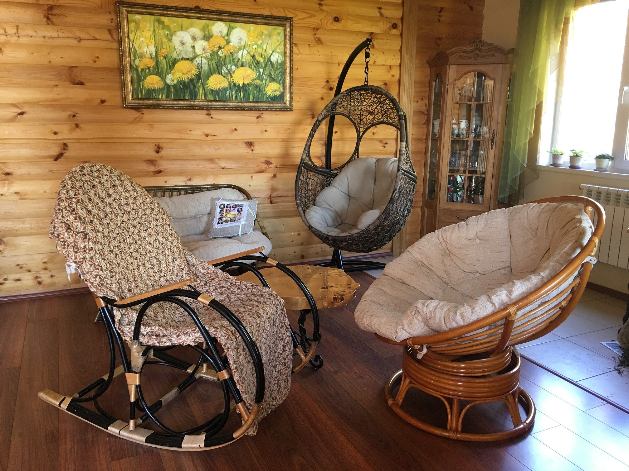 4) и три кресла-качалки в гостиной. Подвесное «яйцо». Огромное гнездо. И классическая качалка, в которой мой супруг очень любит сидеть у камина.