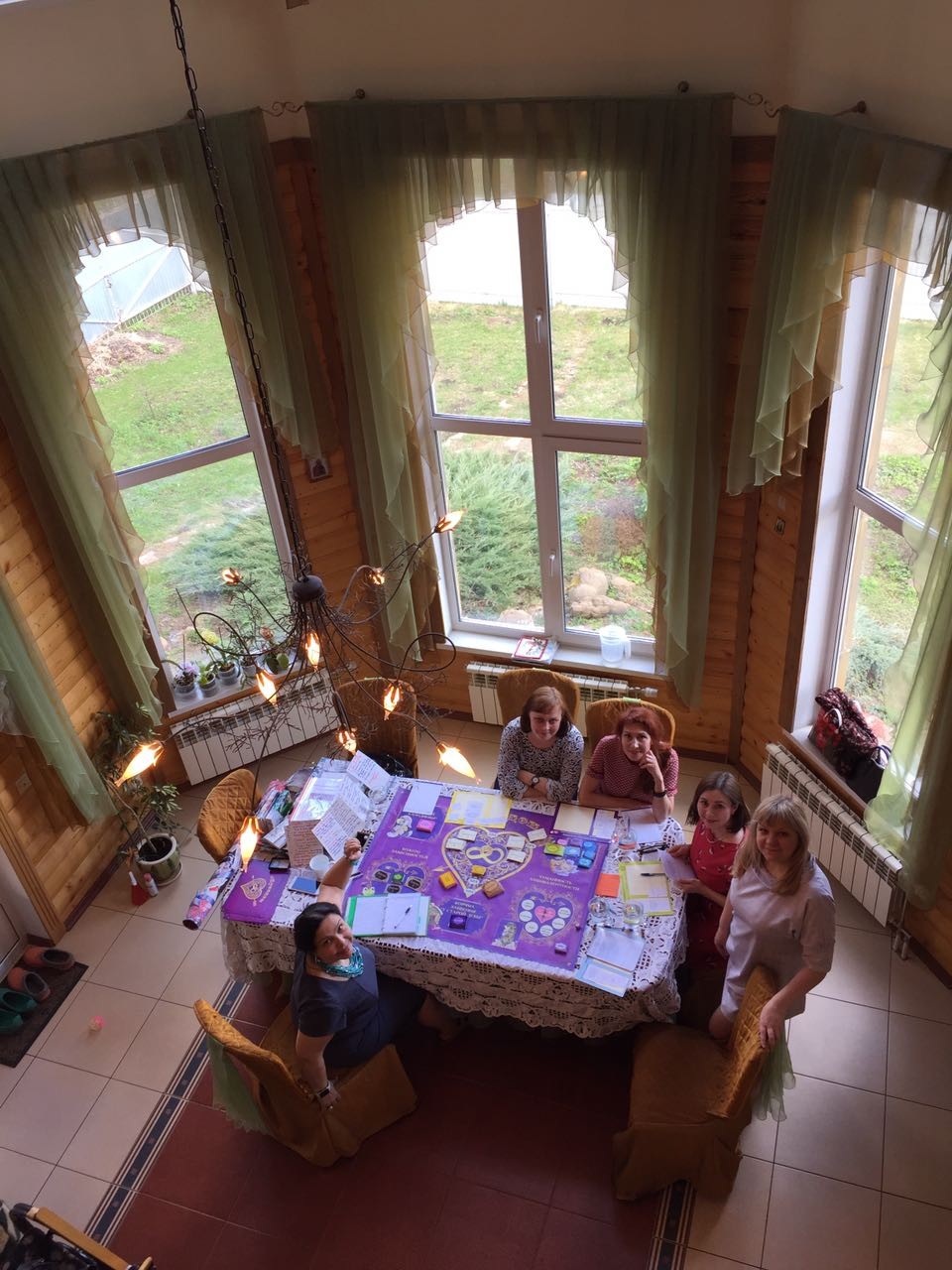 Кстати, это была не индивидуальная терапия, а групповая работа — Нателла участвовала в трансформационной игре «Купидон», которую я вела не просто в реале, а у себя дома, в собственной столовой. Вот полюбуйтесь, как это выглядело)) — супруг нас сфотографировал с галереи зимнего сада.